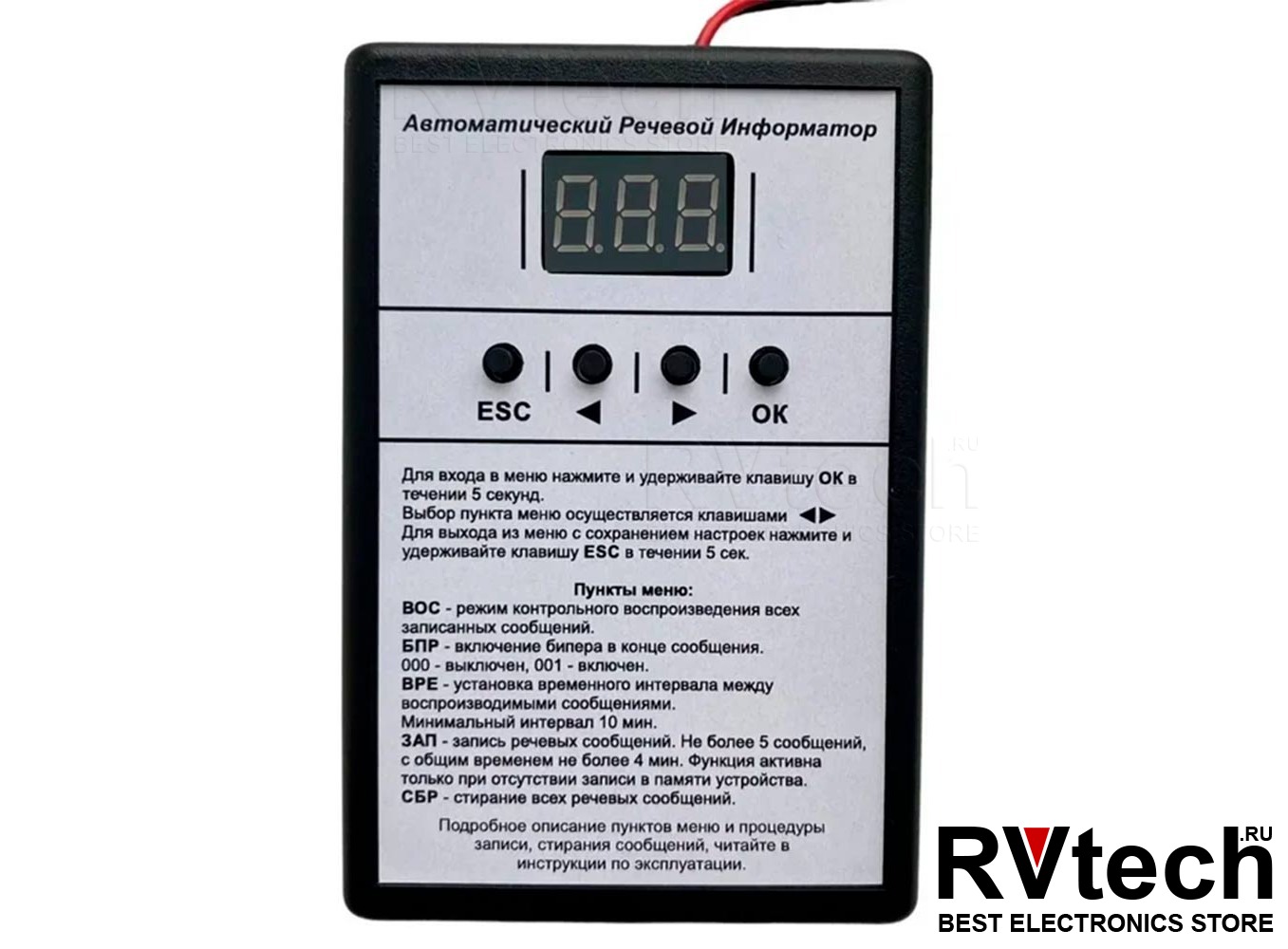 Предусмотрена функция досрочного контрольного воспроизведения записанных сообщений в порядке очереди посредством активации пункта «ВОС» (Воспроизведение) в меню управления. Это удобно для оперативной проверки качества записи и корректности содержания объявлений перед запуском в рабочем режиме. Также имеется возможность включения или отключения тонального сигнала окончания сообщения через пункт «БПР» (Бипер), что позволяет адаптировать устройство под особенности объекта и требования регламентов.